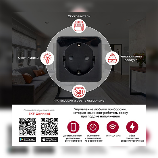 Умная розетка Connect Pro поможет сделать обычные приборы умными. При помощи приложения для Android и iOS, а также при помощи голосовых помощников Алисы от Яндекса, Маруси от VK) можно управлять светильниками, вентиляторами, обогревателями, увлажнителями и любыми другими приборами, которые начинают работать сразу же при подаче напряжения. Версия Pro позволяет измерять напряжение, силу тока, мощность и собирать статистику энергопотребления по дням и месяцам.